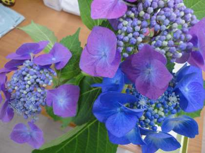中庭には、一本の木からいろいろな色のガクアジサイが咲いています。