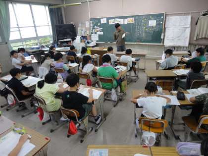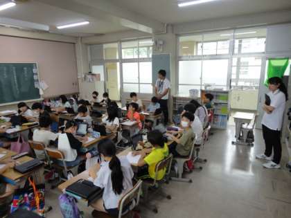 4の1はタブレットを活用した調べ学習です。今日から教育実習の先生が来てくださっていますよ。
