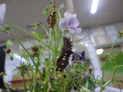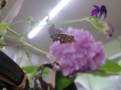 水曜日に子どもたちが遊んでいたツマグロヒョウモンチョウの幼虫もサナギになりました。