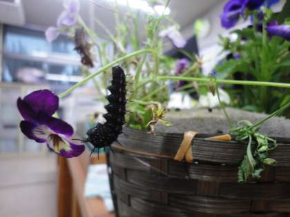 真ん中の写真は、金曜日の夜です。ビオラにつかまって動かなくなっていました。月曜日の朝は一番下の写真です。