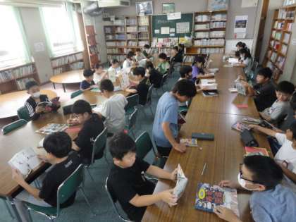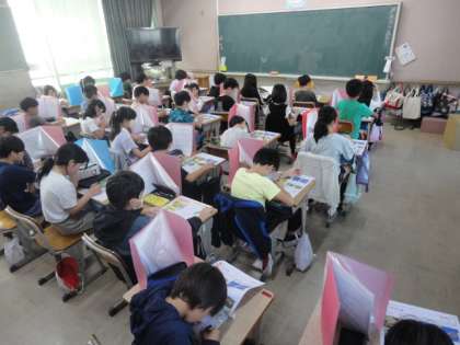 4の1は理科のテスト中です 4の2は図書室で読書タイムです