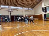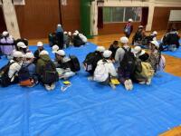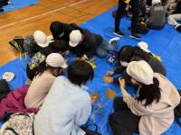 少年自然の家に到着しました。雨なので、体育館でスプーン作りをします。