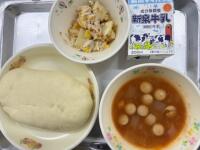 今日の献立はオリーブパン・ミネストローネ・ツナとポテトのマヨネーズ風味焼き・牛乳...