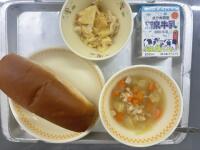 今日の献立は黒糖パン・チキンブロス・ツナとポテトのマヨネーズ風味焼き・牛乳でした...
