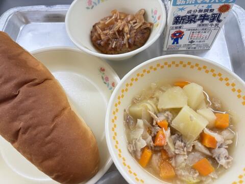 本日の給食は、黒糖パン・ポトフ・ハンバーグきのこソース・牛乳です。