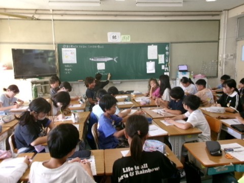 5年生の食育の授業の様子です。魚を食べると,どんないいことがあるか,考えました。