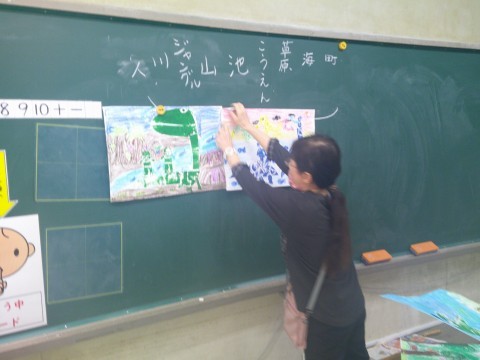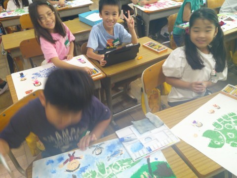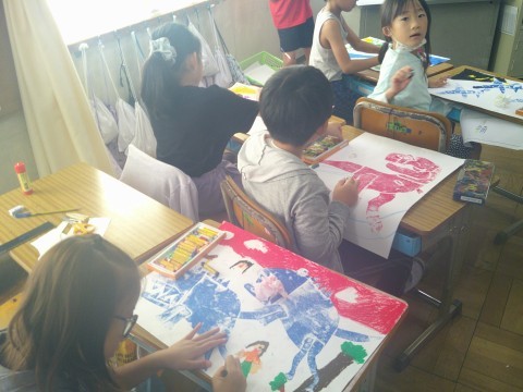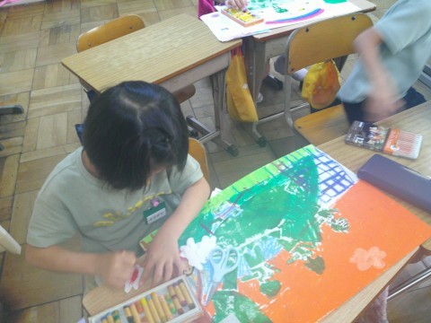 版画の部分は出来上がって、今日は背景に色をつけていました。