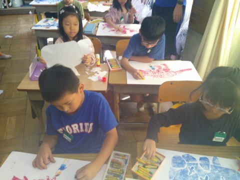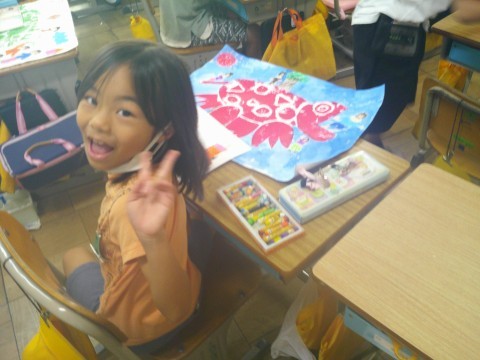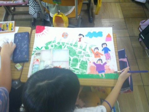 恐竜と一緒に遊ぶ自分や友達を描き加え、完成間近のようです。
