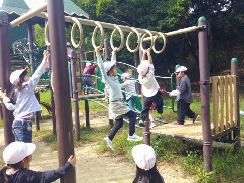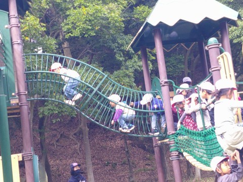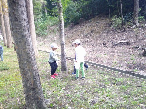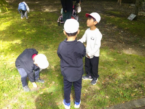 クラスごとに「どんぐり拾い」「遊具コーナー」「松ぼっくりさがし」の3つに分かれて、順繰りに移動しました。