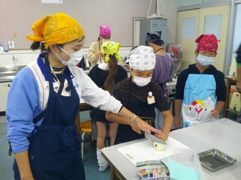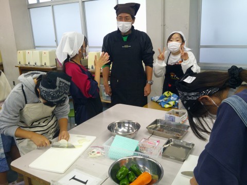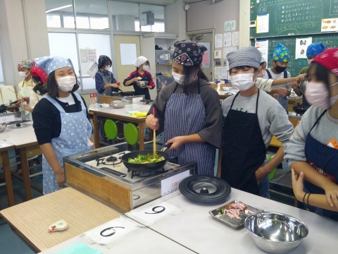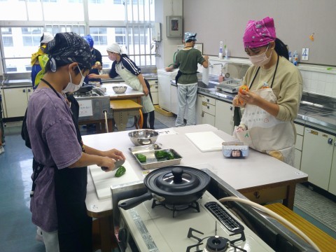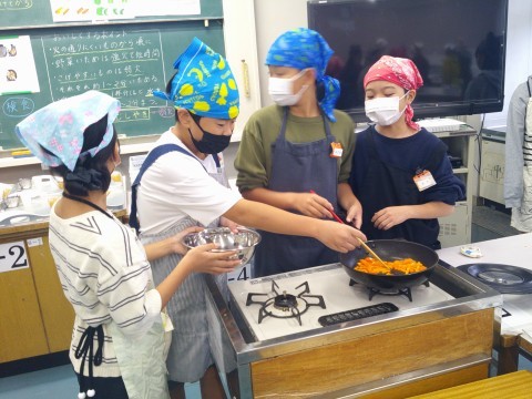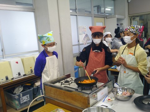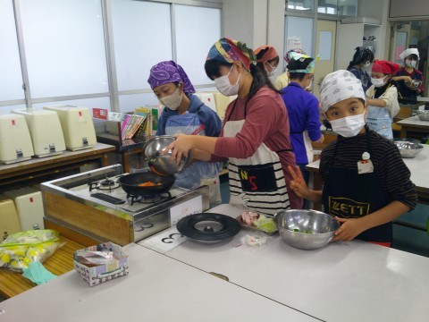 「朝ごはん、少なかったからラッキー!」「いい匂い」など、調理実習への意欲が高く、テキパキと進めていました。