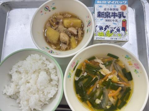 今日の献立は、ご飯・鶏肉とさつま芋のピリ辛煮・にらとうずら卵のスープ・牛乳でした。