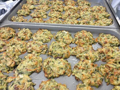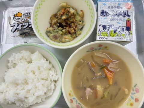 今日の給食はごはん・小松菜のお好み焼き・豚汁・ミニフィッシュ・牛乳です。