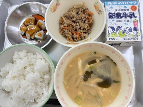 今日の給食は、ごはん・みそ汁・セルフごぼうごはん・さといもの照り焼きでした。