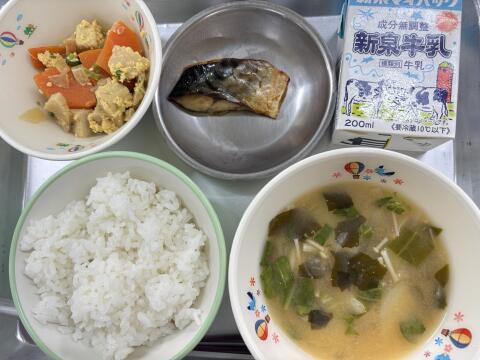今日の給食は、ごはん・焼きさば・高野豆腐の卵とじ・みそ汁・牛乳です。