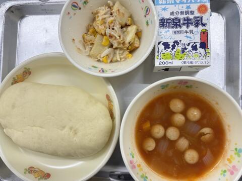 今日の献立はオリーブパン・ミネストローネ・ツナとポテトのマヨネーズ風味焼き・牛乳です。