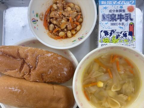 今日の給食はミニパン・揚げパン・マカロニスープ・ミートビーンズ・牛乳です。