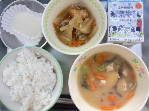 今日の給食はごはん・さつま汁・肉大根・ういろう・牛乳でした。