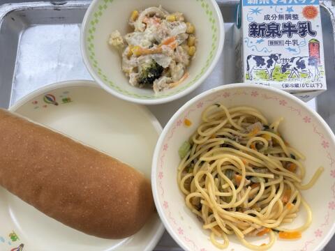 今日の給食は、ミニコッペパン・じゃこと小松菜のスパゲッティ・花野菜のマヨネーズ風味焼・牛乳でした。