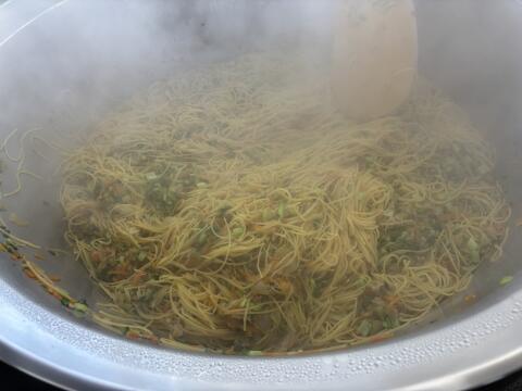 調理員さんがたっぷりのお湯でスパゲティを茹で、手早くじゃこと小松菜を混ぜ、美味しく仕上げてくれました。