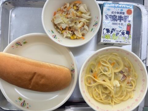 今日の給食はミニコッペパン・クリームスパゲティ・ホットサラダ・牛乳でした。