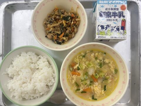 今日の献立はごはん・トック・ビビンバ風・牛乳です。ビビンバはご飯と混ぜて食べる韓国の混ぜごはんで、トックは、うるち米で作った韓国のおもちの入ったスープです。どちらも人気メニューでご飯をしっかり食べてくれていました。
