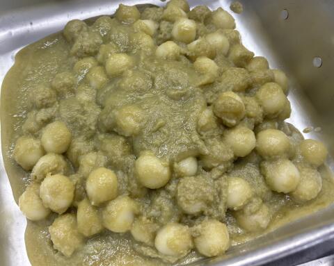 今日の給食は『さかいの日献立』で、ごはん・むらくも汁・かむかむさかいっ子丼・くるみもち・牛乳です。