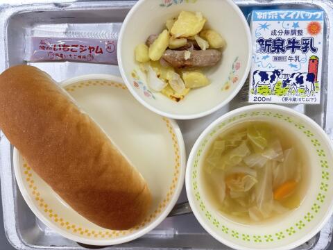 今日の献立はコッペパン・春野菜スープ・ウインナーポテト・いちごジャム・牛乳です。