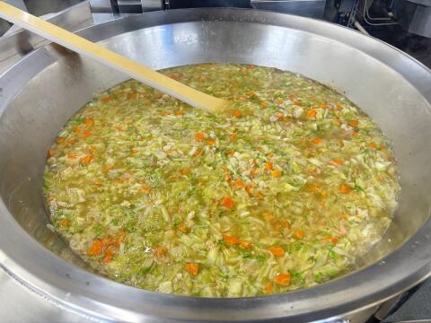 春キャベツ・新玉ねぎ・絹さやなどの春野菜をたっぷり使用し、スープを作りました。