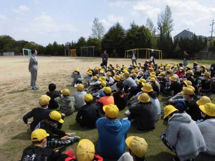 6年生が空の青さと芝生の緑に挟まれて、学年集会を開きました。