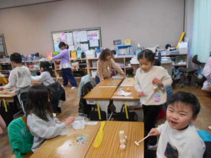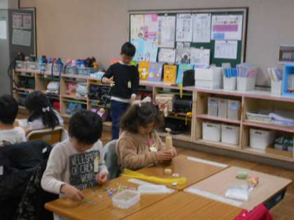 今回の昔遊びは、お手玉・けん玉・おはじき・だるま落としです。班で順番にしました。「前よりもうまくできた!」と喜んでいました。