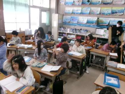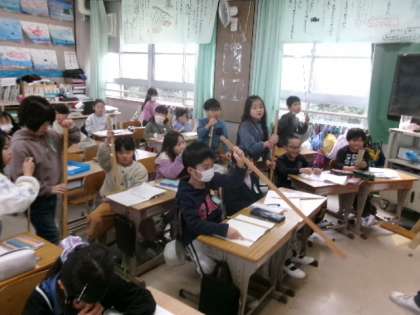2年生が1mの物差しを使って、大きい物や長い物の長さを計っていました。