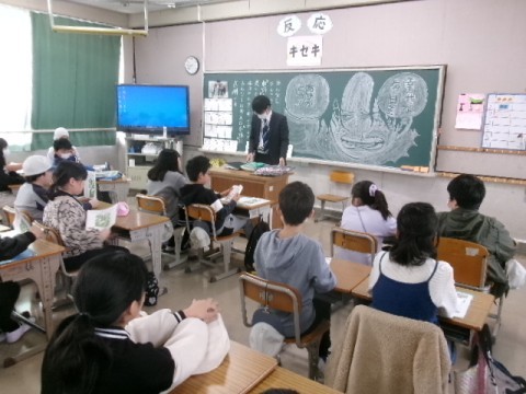 5年生の教室では、先生の話を聞いて持ち帰る物の点検や、来年の準備として帽子用の紐をつけていました。