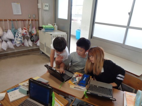 教科書やインターネットを使って調べたことは、タブレットを使って共同作業でまとめています。