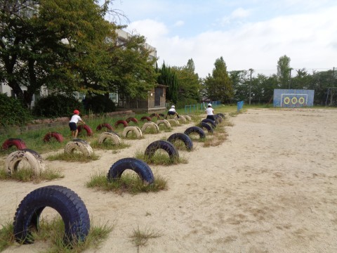 跳び箱遊びにむけて、タイヤ跳びをしました。