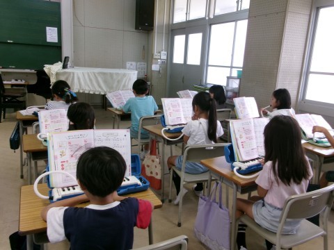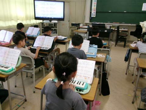 音楽の時間がありました。リズム打ちの練習や、鍵盤ハーモニカの練習を頑張っていました。