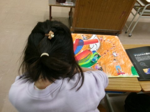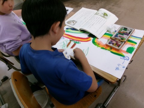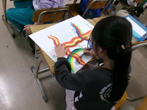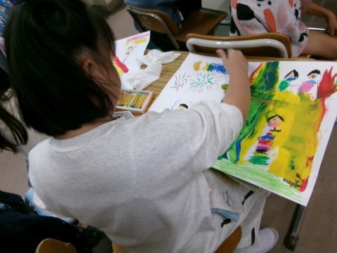 前回「えのぐひっぱレインボー」で描いた線に、クレパスで絵を付け加えました。