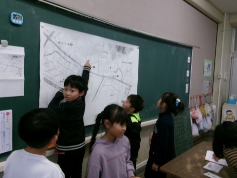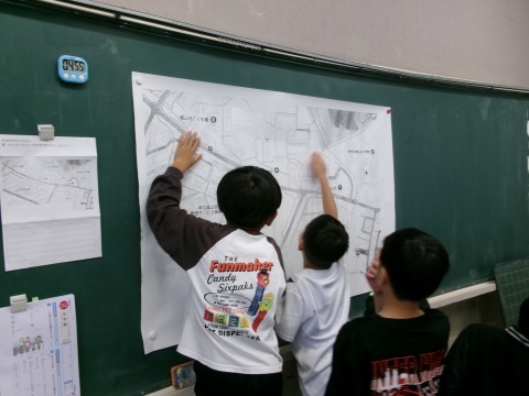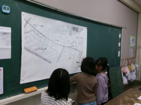 学校に帰ってきたあと、地図を見ながら、「このあたりに、こども園があったね。」「お医者さんがいっぱいかたまっている場所があったよね。」「薬局もあったよ。」と気づいたことを話していました。
