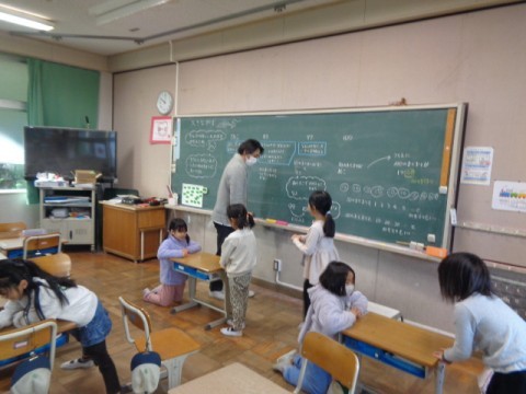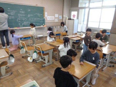 1年生が算数の時間なのに,おはじきを使ったゲームをしていました。