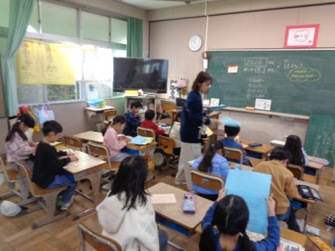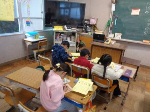 1年生が絵馬のプリントに,今年の目標を書いていました。