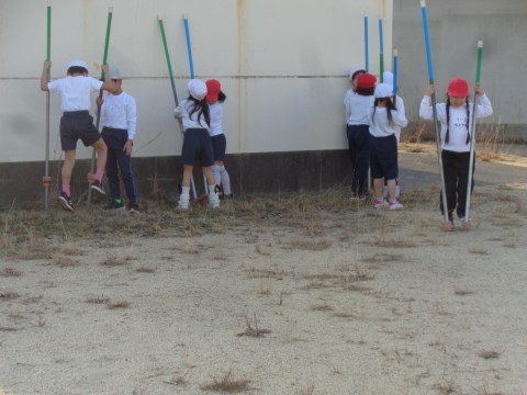 体育の時間に,竹馬や羽根つきの体験をしました。