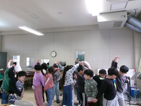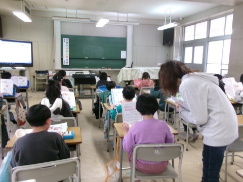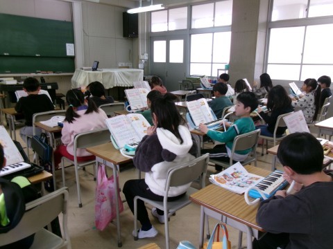 音楽の時間がありました。わらべ歌の「なべなべそこぬけ」を実際にしたり、鍵盤ハーモニカの練習をしたりしました。