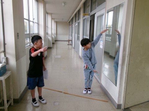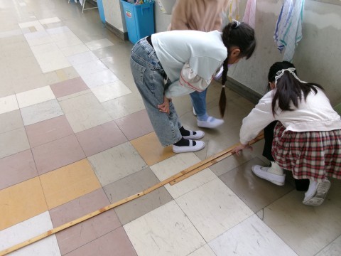 算数の時間に.「長い長さ」の学習をしています。「教室の外でも測ってみたい!」という声があったので、実際に測ってみました。