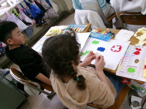 図工の時間に、ステンシル版画に取り組んでいます。好きな形に切った型を使って、スポンジにつけた絵の具でポンポン押していきました。