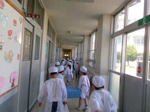 給食が始まって1週間です。当番の仕事を頑張っています。