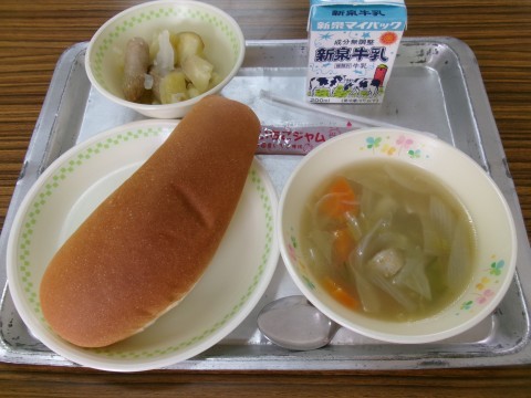 今日の給食 4/22(水) 公開日 2026/04/22 更新日 2026/04/22 今日の給食 今日の給食は コッペパン 牛乳 春野菜スープ ウインナーポテト いちごジャム です。春野菜スープに入っている「きぬさや」は,えんどう豆のなかまで,春が旬の食べ物です。さやが絹のようにやわらかいので,きぬさやと呼ばれるようになりました。