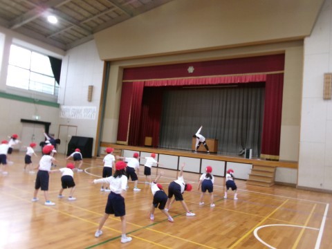 1年生は、1組と2組一緒に体育をしました。体育館で並ぶ練習をした後、堺っ子体操をしました。