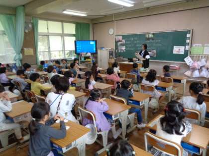 今日は、学校にあるほかの場所について勉強しました。給食場の写真や図書室の写真、保健室の写真を見ました。