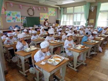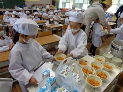 今日から給食がスタートです。 みんな上手に当番もできました。