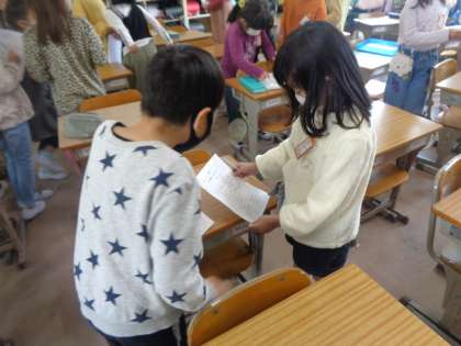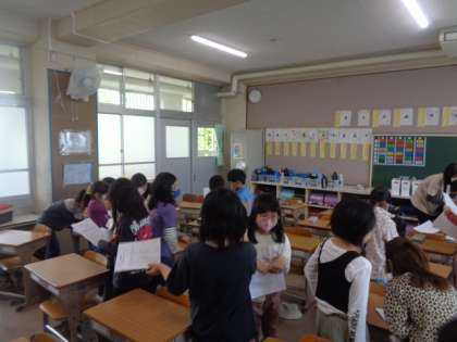 自己紹介を行いました。出会った友達とジャンケンをして、質問をし合いました。いろいろな人と話すことができて楽しかったようです。