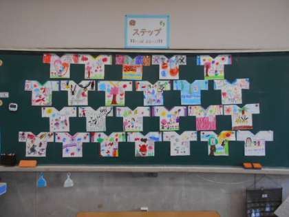 図工の時間に「じぶんだけのオリジナルTシャツ」を描きました。いろいろな絵や模様を描いて、楽しいTシャツができました。